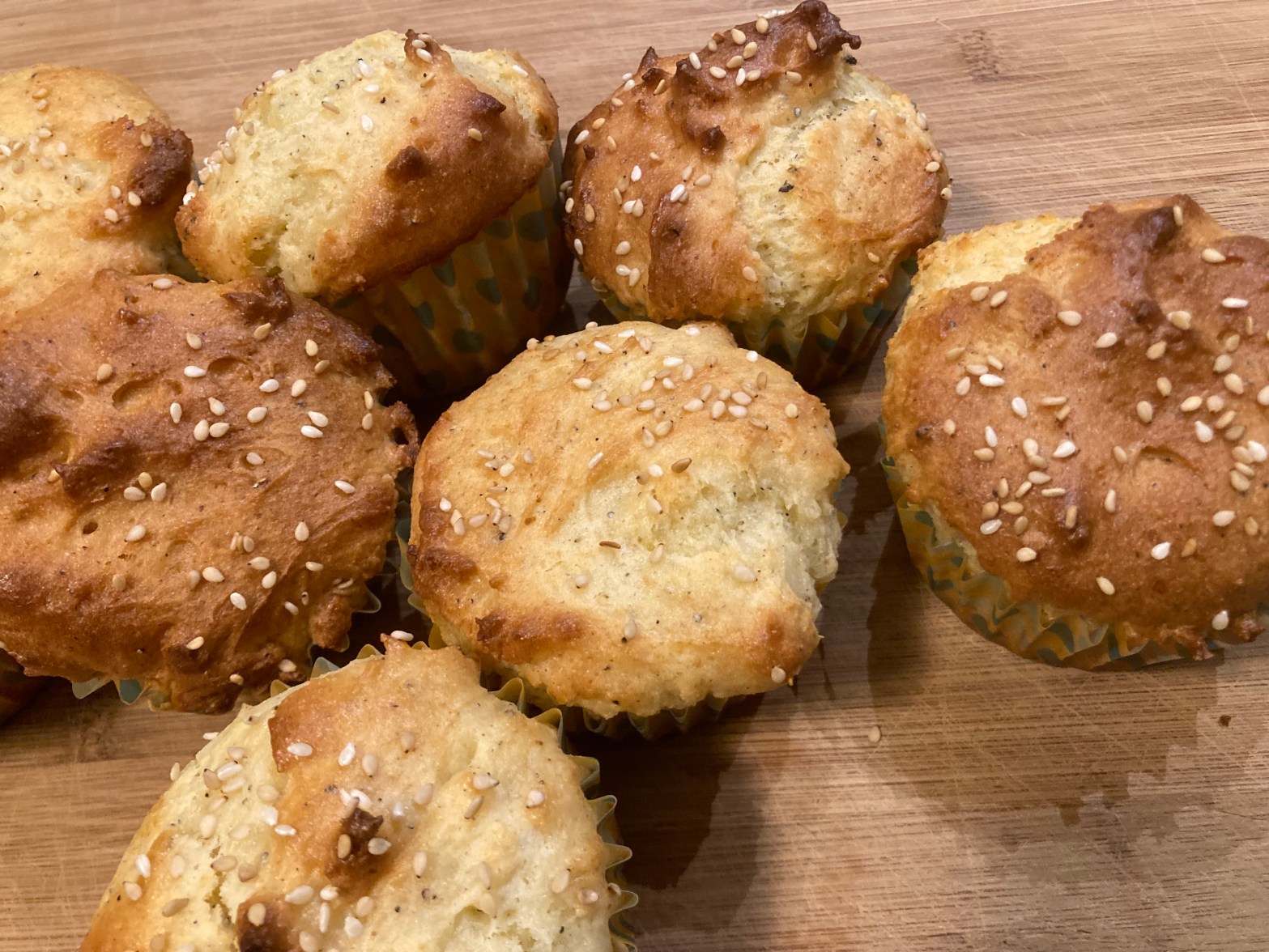 - Using an large spoon or scoop, fill the muffin liners. Then sprinkle the tops with sesame seeds.