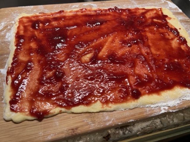 Spread with half of the jam, leaving one of the short ends uncovered for the last inch.