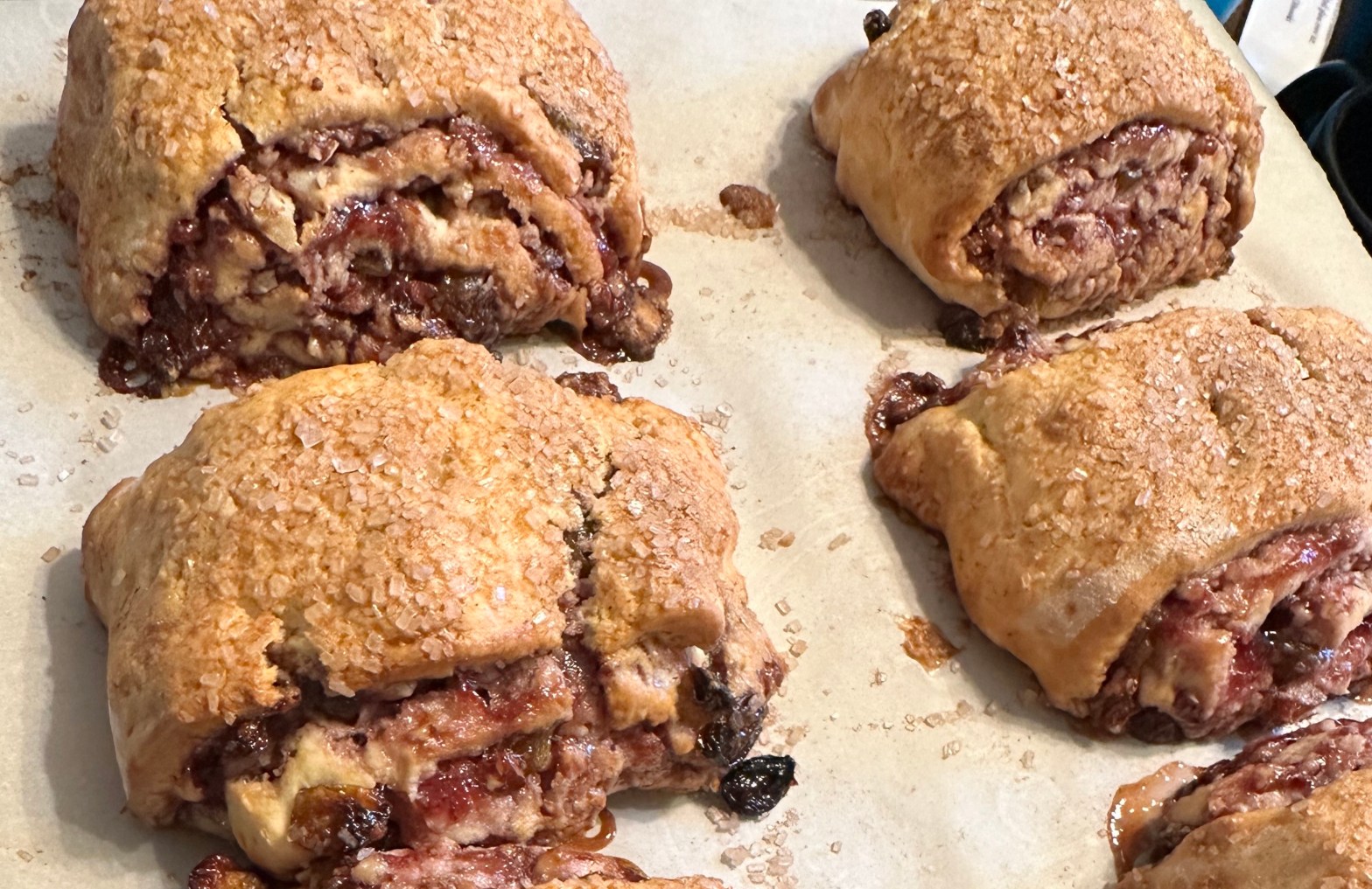 I don’t often wax rhapsodic about a recipe, but I’ll make an exception here. At one point, in the possibly distant past, a muse stepped out onto the landscape of a little Russian Jewish village. She whispered into the ear of a grandmother while she was baking, and a kitchen miracle happened. She took raspberry jam, sultanas, and pecans, and rolled them up in a barely-sweet, baking-powder leavened dough. Maybe it was a Hanukkah miracle. However it happened, the end result was heavenly. Years later, either that family, or perhaps the whole village, emigrated to Cleveland, and brought the recipe with them. Even though I’m just a goy, the Russian Tea Biscuits from Davis have always been one of my very favorite pastries.