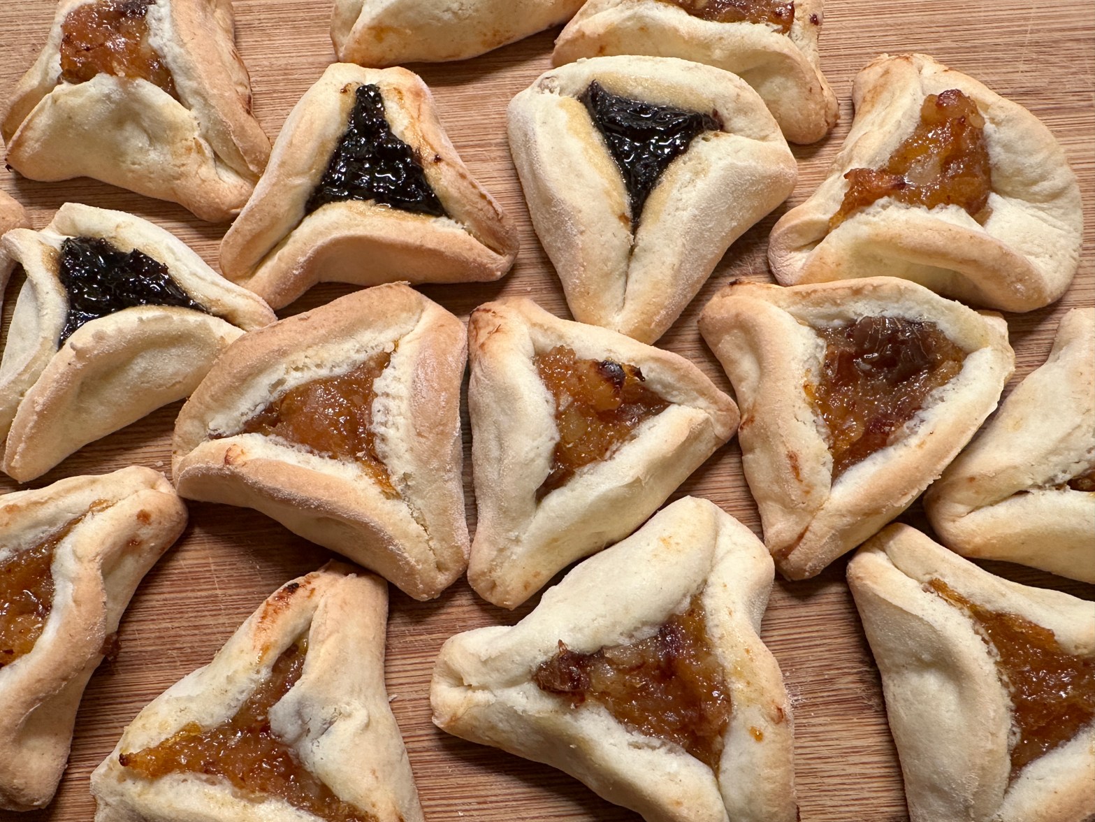 Divide the dough into 3-4 pieces and roll out to about 4-5 mm thick on a well floured board. Using a 3 inch cutter, cut the dough into circles. Top each circle with about 1 tsp of the filling. Fold the three sides over the filling to form triangles. Pinch the corners a bit and arrange on a parchment covered baking sheet about 1 inch apart.
